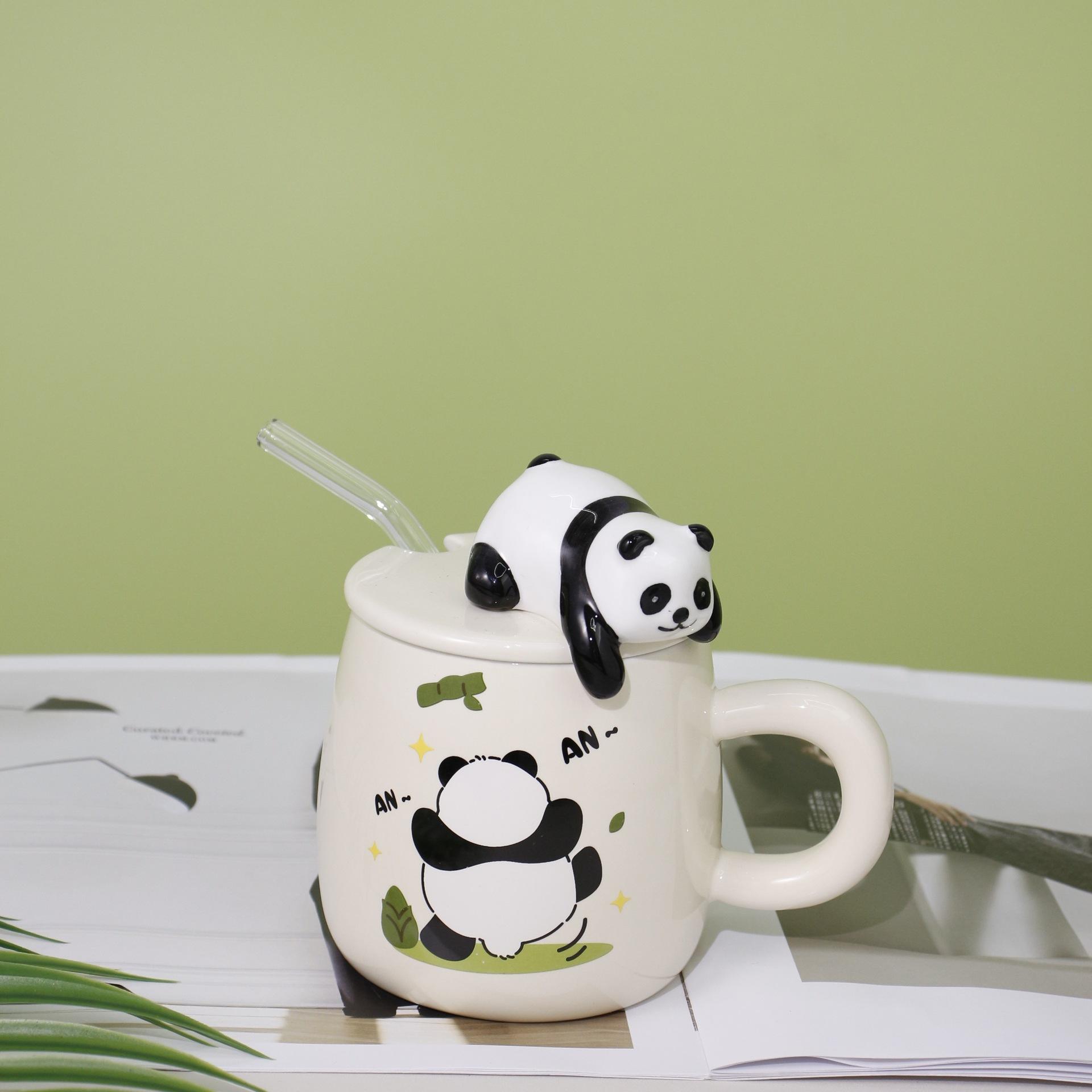 400ml Creative Cute Ceramic Panda Coffee Cup with Lid and Glass Straw Embossed Cartoon Design for Household or Office Use